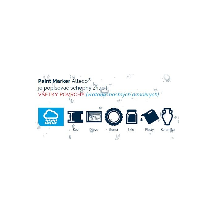 Farebný popisovač ALTECO Paint Marker je na olejovej báze, matný, rýchloschnúci a vodeodolný. Určený je k maľovaniu alebo označovaniu keramiky, skla, papieru, plastu, gumy, ocele a dreva.