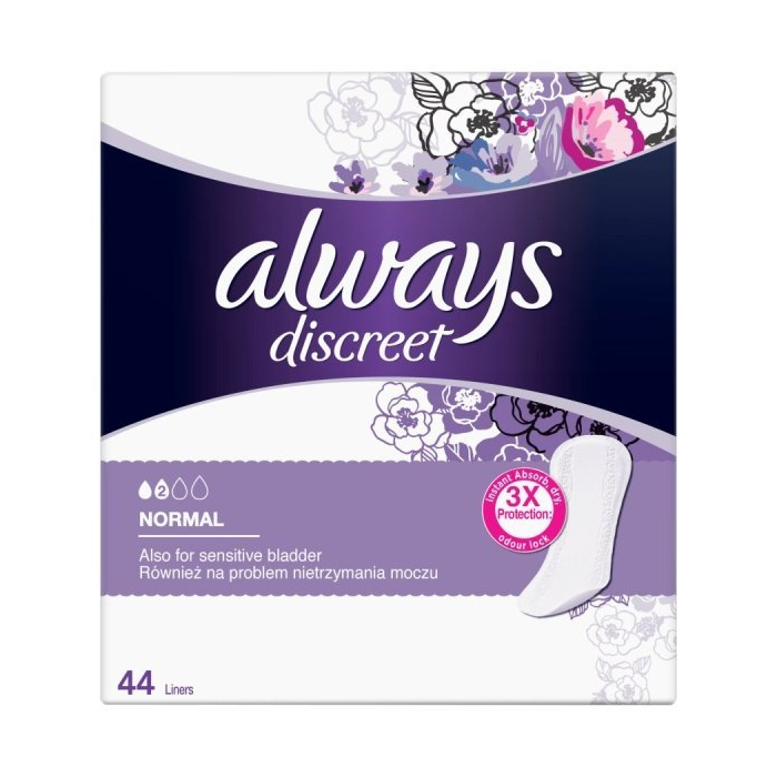 Hygienické inkontinečné slipové vložky Always Discreet vás ochránia počas dní mimo vašej periódy. So špeciálnou technológiou Odour Lock uzamknú neželané pachy vo vnútri vložky. Vy tak ostávate chránená, s pocitom pohodlia.