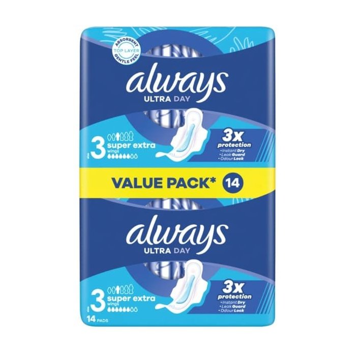 Zvoľte si trojnásobnú ochranu s hygienickými vložkami Always Ultra Super Extra (veľkosť 3) a užite si maximálny komfort. Tieto vložky sú vybavené absorpčnou a jemnou vrchnou vrstvou, ktorá vďaka technológii InstantDry absorbuje tekutinu v priebehu niekoľkých sekúnd. Technológie LeakGuard a OdourLock efektívne zabraňujú pretečeniu a nepríjemným zápachom, aby ste sa mohli sústrediť na to, čo je pre vás dôležité. Ich jedinečné krídelká ComfortLock sú navrhnuté tak, aby perfektne sadli na akúkoľvek spodnú bielizeň. Pre extra ochranu počas noci vyskúšajte vložky z radu Always Night. Vložky Always Ultra sú dermatologicky schválené organizáciou Skin Health Alliance, takže sa môžete cítiť bezpečne a pohodlne po celý deň!