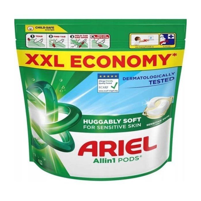 • pracie kapsuly Ariel Sensitive Skin Allin1, výhodné XXL ECONOMY balenie