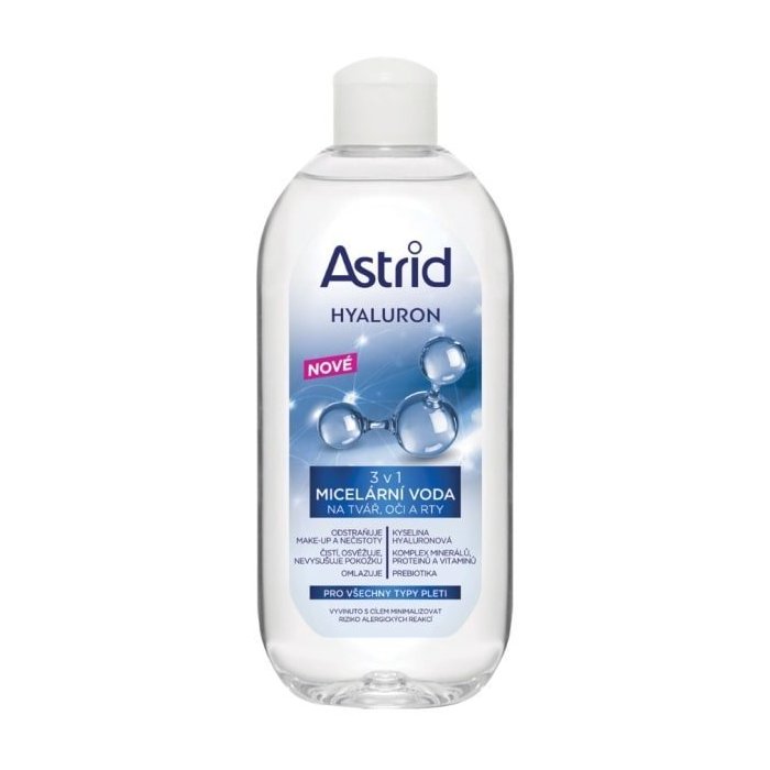 Astrid Hyaluron micelárna voda¬ účinne odstraňuje make-up, mastnotu a nečistoty a zanecháva pleť dôkladne čistú a hladkú. Ľahké zloženie s kyselinou hyalurónovou, obohatené o komplex minerálov, proteínov a vitamínov, ju dôkladne a zároveň jemne čistí. Pleť potom vyzerá plnšie a zdravšie. Kyselina hyaluronová je známa tým, že intenzívne hydratuje a vypĺňa pokožku, zatiaľ čo komplex minerálov, proteínov a vitamínov pomáha posilňovať prirodzenú bariéru pokožky a omladzuje ju. Obsiahnuté prebiotiká pomáhajú kožnej flóre udržať rovnováhu a podporujú jej zdravý vzhľad. Vhodné pre všetky typy pleti. Dermatologicky a oftalmologicky testované. Vyvinuté s cieľom minimalizovať riziko alergických reakcií. Pleť je dôkladne čistá, hydratovaná, jemnejšia, omladená a vyzerá plnšie*.