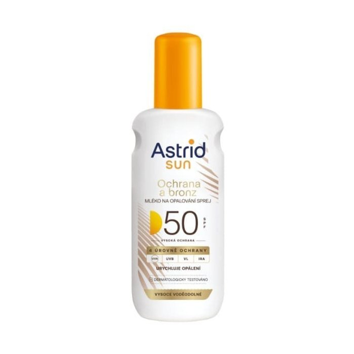 Astrid Sun Bronz a Ochrana OF50 je ideálne opaľovacie mlieko v spreji pre tých, ktorí chcú spojiť veľmi vysokú ochranu pred slnkom s prirodzene krásnym opálením. Produkt poskytuje širokospektrálnu ochranu pred UVA, UVB, viditeľným svetlom (VL) a infračerveným žiarením (IRA), ktoré môžu pokožku poškodzovať.