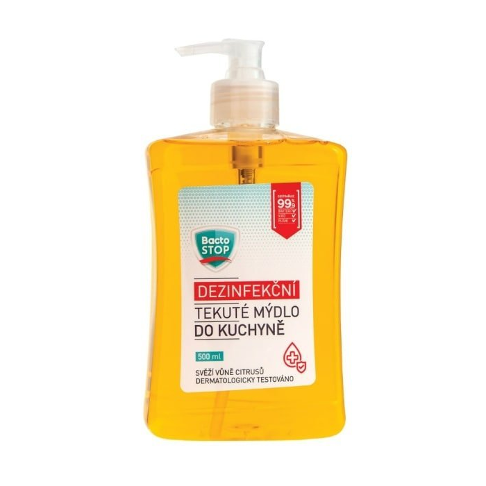 BactoStop dezinfekčné tekuté mydlo do kuchyne na umývanie rúk so sviežou vôňou citrusov. Mydlo určené na umývanie rúk v kuchyni, ktoré eliminuje nepríjemné pachy priľnavé na rukách pri varení a zároveň aktívne pôsobí na obalené vírusy (testované podľa normy EN 14476) a baktérie (testované podľa normy EN 1276). Obsahuje prídavné látky, ktoré pomáhajú hydratovať pokožku rúk.