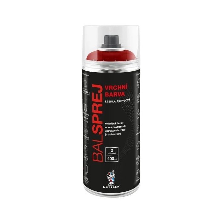 BALSPREJ je univerzálna lesklá vrchná farba v spreji použiteľná na nátery dreva, kovu, karosérií, niektorých umelých hmôt. Vyniká výdatnosťou, je rýchloschnúci, po nástreku nesteká. Je odolná proti poveternostným vplyvom a korózii. Je prestriekateľná Bezfarebným akrylovým lakom v spreji.