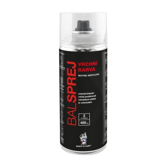 BALSPREJ je univerzálna lesklá vrchná farba v spreji použiteľná na nátery dreva, kovu, karosérií, niektorých umelých hmôt. Vyniká výdatnosťou, je rýchloschnúci, po nástreku nesteká. Je odolná proti poveternostným vplyvom a korózii. Je prestriekateľná Bezfarebným akrylovým lakom v spreji.