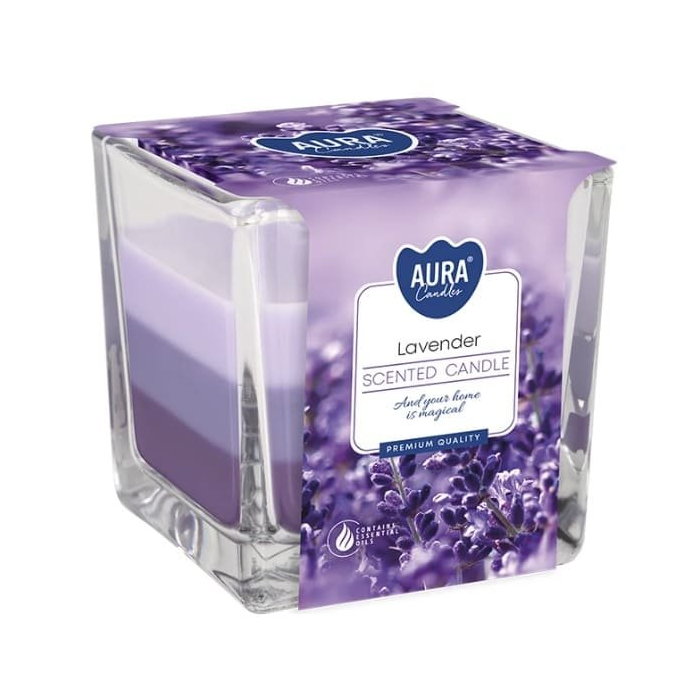 Dekoratívna 3-farebná vonná sviečka v skle s vôňou levandule.