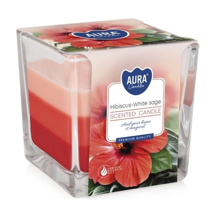 Dekoratívna 3-farebná vonná sviečka v skle s vôňou ibišteku a šalvie.