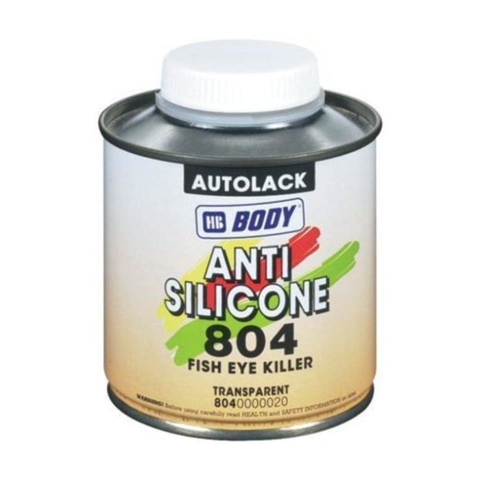 Prísada vhodná ako prevencia proti vytváraniu silikónových kráterov. 10ml z 804 ANTI SILICON (približne jeden vrchnák) pridať do 500ml (jedna nádobka striekacej pištole) namiešanej farby. Zmes musí byť nanesená v tenkých vrstvách až pokiaľ krátery nezmiznú. Po pridaní ANTI SILICON 804 do farby, zmes dobre premiešať.