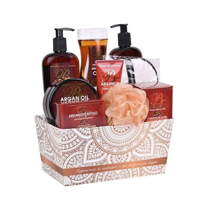 Darčekový kôš výživnej kozmetiky so vzácnym arganovým olejom z Maroka pre starostlivosť o pokožku tela i tváre. Doprajte svojim blízkym luxus s nádychom Orientu.