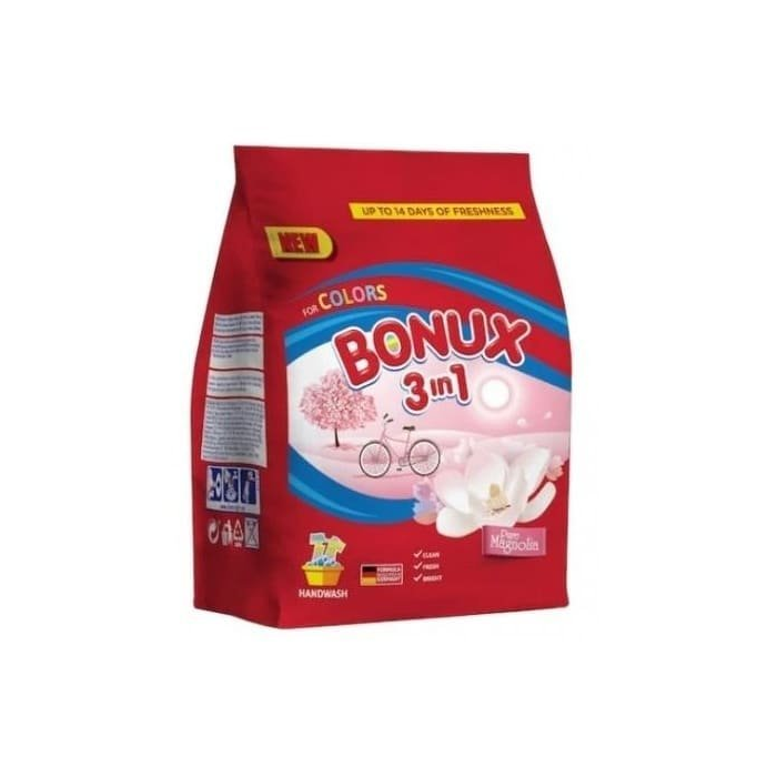 Prací prášok Bonux Magnolia 3v1 poskytuje dlhotrvajúcu vôňu Vašej bielizne, dodáva jej úžasnú jemnosť a ešte dokonca vďaka novým aktívnym časticiam dokonalejšie vyperie a zabraňuje usadzovaniu vodného kameňa.