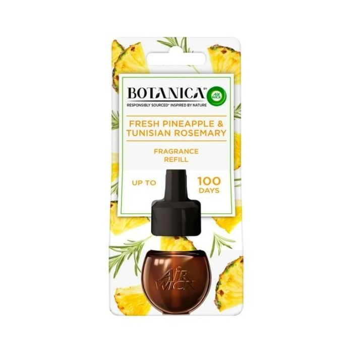 Inšpirujte váš domov prírodou! Náhradná tekutá náplň do elektrického osviežovača vzduchu Botanica by Air Wick s vôňou svieži ananás a tuniský rozmarín navodí príjemnú atmosféru v každej miestnosti a rozmazná všetky vaše zmysly. Esenciálne oleje sú zodpovedne získavané a príjemná súhra sviežeho ananásu a tuniského rozmarínu dodáva vôni jej jedinečnú prirodzenú nôtu.