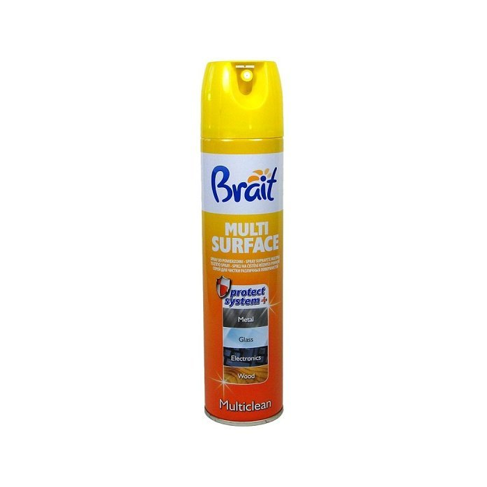 Brait Multiclean - sprej na čistenie rôznych povrchov, unikátna technológia "Protect System +" odstraňuje všetky nečistoty, chráni povrchy pred poškriabaním, škvrnami z vody, zanecháva prirodzený lesk a sviežu vôňu.