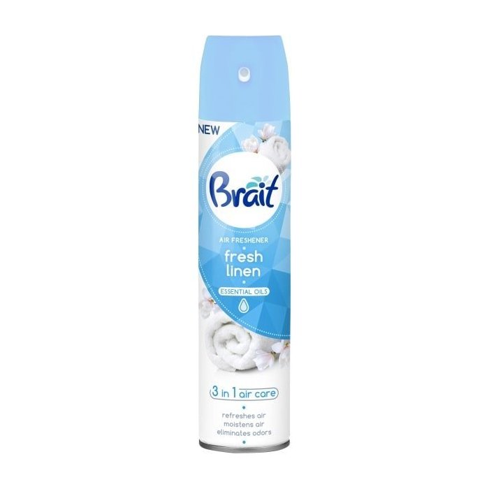 Osviežovač vzduchu s vôňou čistého prádla.Brait má moderný 3v1 Air Care vzorec, ktorý zaručuje trojaký účinok: 1. Účinne neutralizuje a pohlcuje nepríjemný zápach. 2. Osviežuje vzduch. 3. Zvlhčuje vzduch, v miestnosti ostáva pocit sviežosti a čistoty.Brait osviežovač vzduchu vďaka špeciálnemu vzorcu absorbuje pachy a nemaskuje ich.