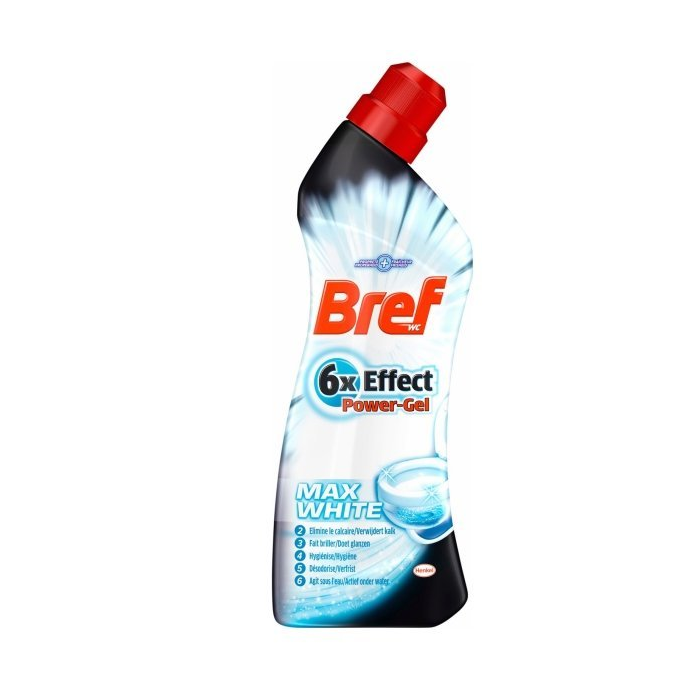 BREF 6x Effect Power Gel Max White WC gél 750ml Bref 6 x effect Revolučná novinka v prémiovom rade čističov toaliet. Bref 6×Effect Micro Brush bol vyvinutý na základe abrazívnej technológie známej napríklad zo zubných pást. Čistič obsahuje mikročastice, ktoré sa viažu na špinu, a tým lepšie odstraňujú nečistoty. Čistenie toalety nikdy nebolo jednoduchšie.