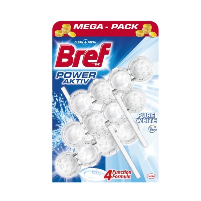 BREF Power Aktiv Pure White tuhý wc blok 3x50g Bref Pure White Aktiv 1. Dokonalá čistota medzi spláchnutiami vďaka účinným látkam obsiahnutým v tyrkysovej vode 2. Účinný proti vodnému kameňu 3. Dokonalá sviežosť 4. Dokonalá hygiena.