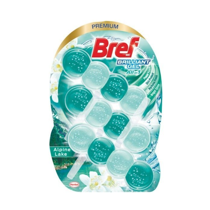 Bref Brilliant Gel Alpine Lake je prvý gélový Bref WC blok. Vďaka svojmu All in 1 zloženiu so štyrmi funkciami udržuje tento WC blok vašu toaletu čistú s každým spláchnutím, zabraňuje usadzovaniu nových nečistôt, ponúka špeciálnu sviežosť a zanecháva dokonalý lesk. Pri spláchnutí toalety sa Bref Brilliant Gel premení na rýchly penový WC čistič, ktorý osvieži vašu toaletu a zanechá príjemnú vôňu. Bref Brilliant Gél je brilantným riešením pre vašu toaletu.