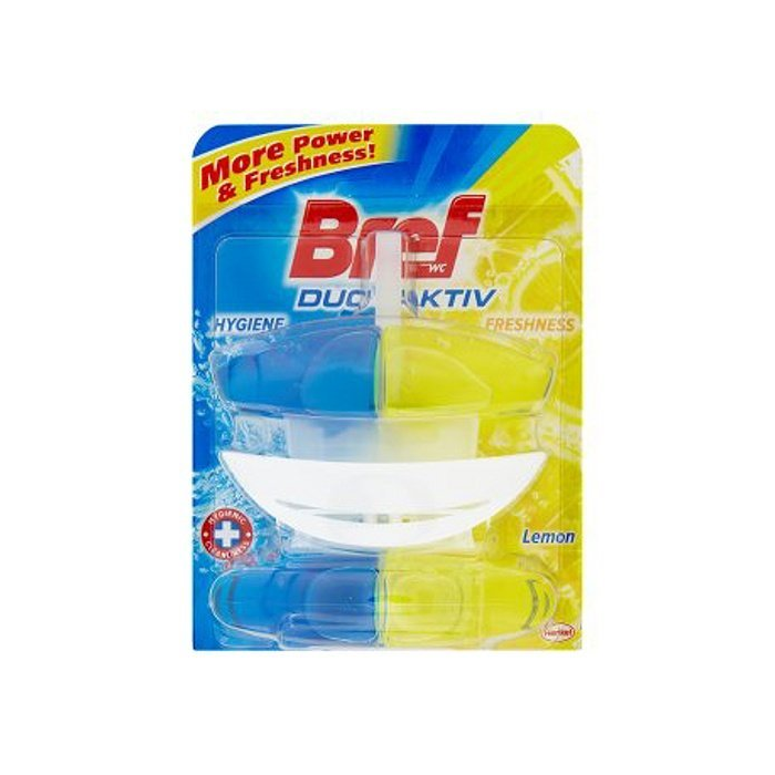 Bref WC Duo Aktiv Lemon, čistiaci wc prípravok s citrónovou vôňou 50ml + 1 x náhradná náplň Bref Duo-Aktiv je tekutý dvojkomorový WC blok pre hygienickú čistotu a dlhotrvajúcu intenzívnu vôňu s každým spláchnutím. Jedna komora obsahuje účinné látky zaisťujúce hygienickú čistotu a druhá parfém.