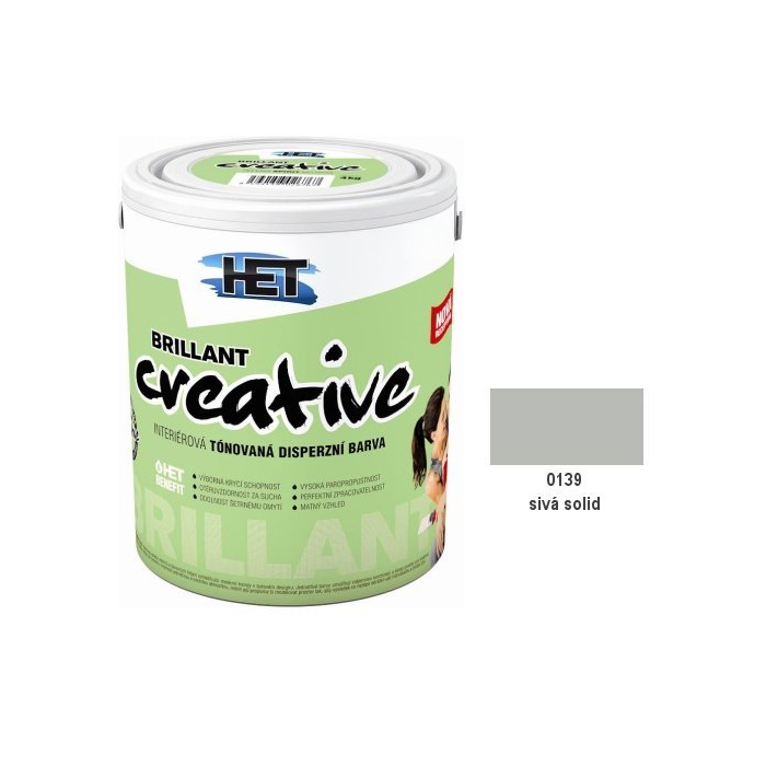 Brillant Creative Tónovaná disperzná farba Brillant Creative interiérová, tónovaná oteruvzdorná disperzná farba, matná, vysoko paropriepustná s výbornou krycou schopnosťou. Dodáva sa v 12 základných farebných odtieňoch + biela. Jednotlivé odtiene farby umožňujú vzájomnú kombináciu a dávajú priestor na kreatívne prístupy. Farba je vhodná na nátery obývacích a komerčných priestorov (detské izby, spálne, jedálne, chodby, kancelárie, predajne).