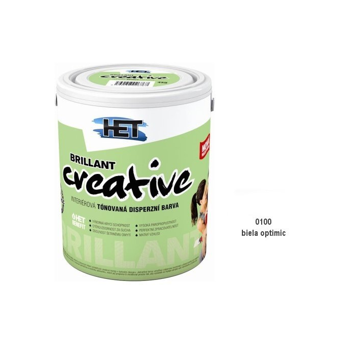 Brillant Creative Tónovaná disperzná farba Brillant Creative interiérová, tónovaná oteruvzdorná disperzná farba, matná, vysoko paropriepustná s výbornou krycou schopnosťou. Dodáva sa v 12 základných farebných odtieňoch + biela. Jednotlivé odtiene farby umožňujú vzájomnú kombináciu a dávajú priestor na kreatívne prístupy. Farba je vhodná na nátery obývacích a komerčných priestorov (detské izby, spálne, jedálne, chodby, kancelárie, predajne).