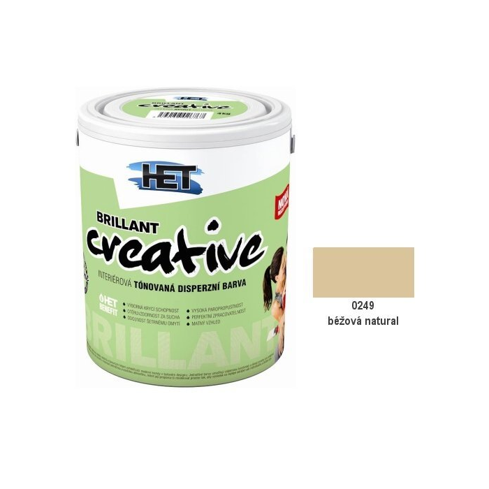 Brillant Creative Tónovaná disperzná farba Brillant Creative interiérová, tónovaná oteruvzdorná disperzná farba, matná, vysoko paropriepustná s výbornou krycou schopnosťou. Dodáva sa v 12 základných farebných odtieňoch + biela. Jednotlivé odtiene farby umožňujú vzájomnú kombináciu a dávajú priestor na kreatívne prístupy. Farba je vhodná na nátery obývacích a komerčných priestorov (detské izby, spálne, jedálne, chodby, kancelárie, predajne).