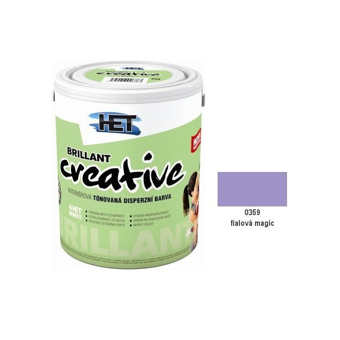 Brillant Creative Tónovaná disperzná farba Brillant Creative interiérová, tónovaná oteruvzdorná disperzná farba, matná, vysoko paropriepustná s výbornou krycou schopnosťou. Dodáva sa v 12 základných farebných odtieňoch + biela. Jednotlivé odtiene farby umožňujú vzájomnú kombináciu a dávajú priestor na kreatívne prístupy. Farba je vhodná na nátery obývacích a komerčných priestorov (detské izby, spálne, jedálne, chodby, kancelárie, predajne).
