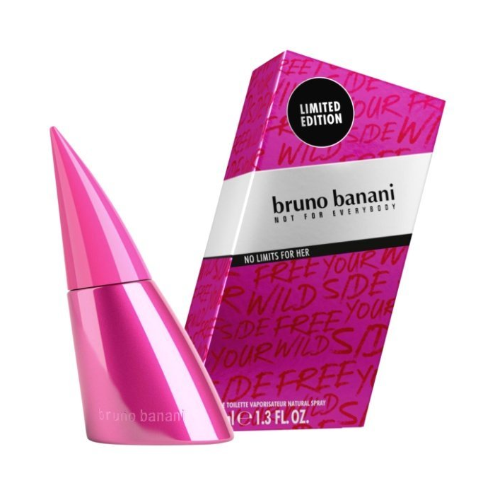 S vôňami No Limits Man a No Limits Woman sa rušia všetky limity a obmedzenia počas horúcich nocí, kedy každý odhalí svoju vnútornú divokú stránku. Nové vône sa stávajú nevyhnutnosťou pre všetkých milovníkov značky bruno banani. Výrazný charakter aksamietnice v spojení so šťavnatou mandarínkou a farebnou vitalitou čiernych ríbezlí ihneď odhaľuje jej žiarivú divokú auru. Delikátny broskyňový kvet, pulz prebúdzajúce kakao, návykovo záhadná vanilka a veselá malina vyvolávajú vo vôni No Limits Woman náladu oslavy nebezpečnej ženskosti.