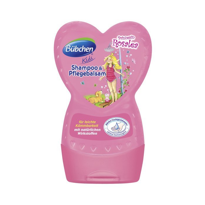BUBCHEN Princezná Rosalea Detský šampón a balzam na vlasy 2v1 230ml BUBCHEN Princezná Rosalea šampón a balzam 2v1 na vlasy je určený pre malé parádnice. Šampón s nežnou kvetinovou vôňou jemne umýva vlásky, ktoré ostávajú hebké, s hodvábnym leskom a ľahko sa rozčesávajú. BUBCHEN šampón a balzam 2v1 je ideálny na starostlivosť o dlhé vlasy. Dlhé a nepoddajné vlasy sa ľahko ročesávajú a zostávajú jemné a splývavé. - obsahuje Aloe vera, pšeničné proteíny, provitamín B5 a umývacie zložky prírodného pôvodu - neobsahuje alergénne vonné látky - nedráždi oči