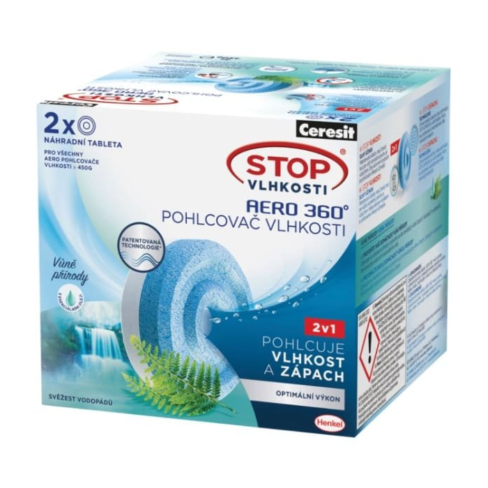 Udržujte optimálnu vlhkosť a svieži vzduch vo vašej domácnosti s náhradnými tabletami Ceresit Stop Vlhkosti Aero 360° Sviežosť vodopádov.
