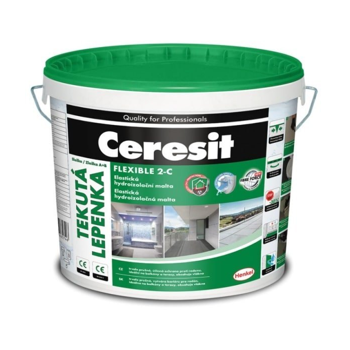Ceresit TEKUTÁ LEPENKA je dvojzložková, trvalo pružná hydroizolačná stierka vystužená špeciálnou kombináciou vlákien. Je vhodná na hydroizolvanie pivníc, zákadov a betónových prvkov.