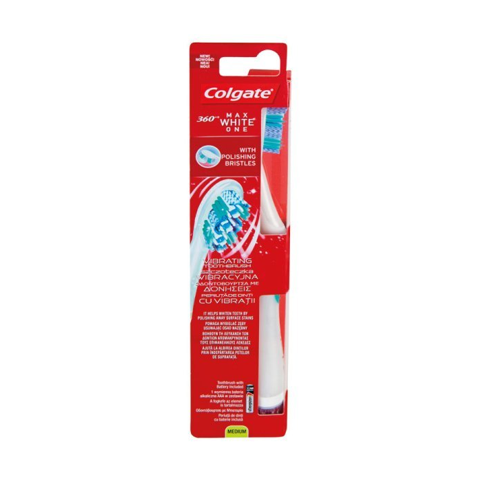 Colgate Max White One microsonic Energy je batériová zubná kefka, ktorá ponúka kombináciu vysokorýchlostnej sonic vibrácie s rôzne zastrihnutými štetinkami pre lepšie odstraňovanie zubného povlaku a baktérií než pri čistení bežnou zubnou kefkou. *Počet kusov v balení. 1 *Tvrdosť: stredná *Napájanie: 1× AAA alkalická batéria (súčasť balenia) Kombinácia vysokorýchlostnej sonic vibrácie s rôzne zastrihnutými štetinkami pre lepšie odstraňovanie zubného povlaku a baktérií než pri čistení bežnou zubnou kefkou. Jedinečná batériová zubná kefka s 20 000 sonic vibráciami za minútu a s jedinečným čističom jazyka a mäkkých tkanív pre jednoduchšie dôkladné čistenie celej ústnej dutiny. Unikátny čistič jazyka a mäkkých tkanív pomáha odstraňovať až 99% baktérií.