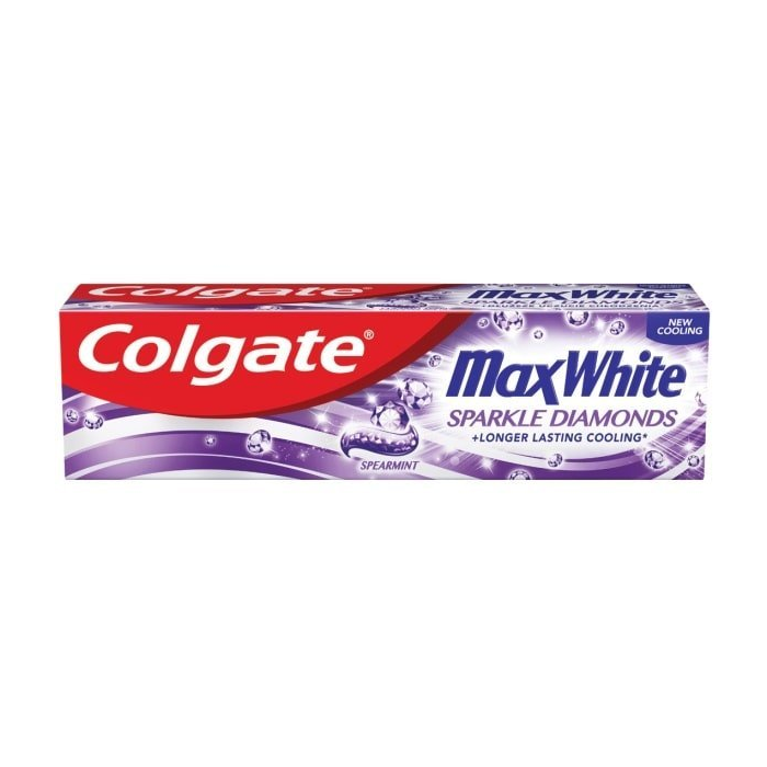 Colgate zubná pasta Max White Sparkle Diamonds rozjasní vašu sklovinu. Bieliaca zubná pasta s technológiou FreshFX taktiež poskytuje dlhotrvajúci chladivý účinok oproti bežnej fluoridovej zubnej paste. Pasta posilňuje zubnú sklovinu a pomáha v boji so zubným kazom. Zažiarite a rozžiarite svoj úsmev so zubnou pastou Max White Sparkle Diamonds od značky Colgate.