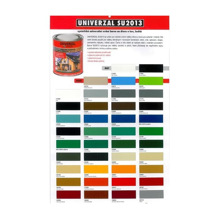 Farba UNIVERZAL SU2013 je vhodná na vrchné lesklé, polomatné alebo matné nátery dreva a kovov vystavených poveternostným vplyvom (ploty, odkvapy, dvere, okná, konštrukcie všetkého druhu, zábradlia a pod.). Nanáša sa na kovové povrchy ošetrené antikoróznou farbou zo série SYNOREX alebo na drevo upravené základnou farbou SYNTECOL PRIMER S2070.