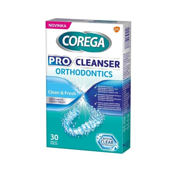 Čistiace tablety na zubné náhrady Corega Pro Cleanser Orthodontics poskytujú každodennú špeciálnu starostlivosť pre rôzne typy vyberateľných ortodontických pomôcok, ako strojčeky, neviditeľné strojčeky, vyberateľné strojčeky, športové chrániče, nočné chrániče. Čistiace tablety prinášajú jemné a neabrazívne čistenie, ničia až 99,99 % baktérií spôsobujúcich zápach z úst, pomáhajú odstraňovať viac škvŕn a nežiaduce zafarbenie. Jedinečné zloženie s Crystal Clear Technology pomôže udržať vašu ortodontickú pomôcku čistú a priehľadnú. S čistiacimi tabletami Corega Pro Cleanser Orthodontics bude vaša ortodontická pomôcka čistá a svieža.