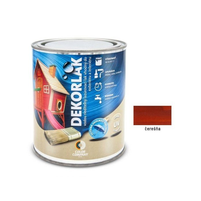 DEKORLAK Vodouriediteľný lazúrovací lak na dekoráciu a ochranu dreva, čerešňa 0,7l DEKORLAK je vodouriediteľný lazúrovací lak na drevo, pre použitie v interiéri a exteriéri. Zvlášť je vhodný na drevený nábytok a hračky pre deti. Môže sa použiť na drevené plochy ako sú dvere, ploty, okenice, záhradný nábytok, pergoly, kovy, drevené štítky, chaty, obloženie stien, stropov atď. "Bezfarebný" DEKORLAK nie je vhodný na použitie v exteriéri. Ostatné farebné odtiene sú vhodné na použite v exteriéri. * ÚV ochrana * DEKORLAK je vhodný na aplikáciu pre hračky podľa STN-EN-71. Použitie: Nanáša na suchý a čistý povrch. Prvý náter sa aplikuje zriedený s vodou v pomere 2:1 až 1:1, podľa savosti dreva. Po zaschnutí sa drevo prebrúsi a odstráni sa brúsny prach. Druhý a tretí náter sa aplikujú neriedené v 4-hodinových intervaloch. Na zabezpečenie komplexnej ochrany dreva sa doporučuje ošetriť drevo pred prvým náterom ochranným prostriedkom Krovsan profi proti biologickým škodcom. Aplikácia: štetcom, valčekom, striekaním Výdatnosť: 10-12m2/1 liter na jednu vrstvu.