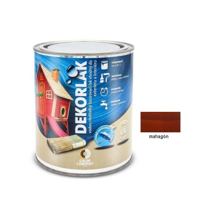 DEKORLAK Vodouriediteľný lazúrovací lak na dekoráciu a ochranu dreva, mahagón 0,7l DEKORLAK je vodouriediteľný lazúrovací lak na drevo, pre použitie v interiéri a exteriéri. Zvlášť je vhodný na drevený nábytok a hračky pre deti. Môže sa použiť na drevené plochy ako sú dvere, ploty, okenice, záhradný nábytok, pergoly, kovy, drevené štítky, chaty, obloženie stien, stropov atď. "Bezfarebný" DEKORLAK nie je vhodný na použitie v exteriéri. Ostatné farebné odtiene sú vhodné na použite v exteriéri. * ÚV ochrana * DEKORLAK je vhodný na aplikáciu pre hračky podľa STN-EN-71. Použitie: Nanáša na suchý a čistý povrch. Prvý náter sa aplikuje zriedený s vodou v pomere 2:1 až 1:1, podľa savosti dreva. Po zaschnutí sa drevo prebrúsi a odstráni sa brúsny prach. Druhý a tretí náter sa aplikujú neriedené v 4-hodinových intervaloch. Na zabezpečenie komplexnej ochrany dreva sa doporučuje ošetriť drevo pred prvým náterom ochranným prostriedkom Krovsan profi proti biologickým škodcom. Aplikácia: štetcom, valčekom, striekaním Výdatnosť: 10-12m2/1 liter na jednu vrstvu.