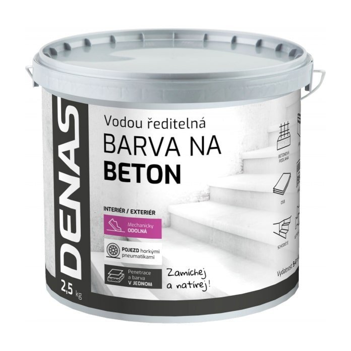 DENAS BETÓN je vodou riediteľná vrchná krycia farba na báze akrylátovej disperzie obsahujúce stálofarebné pigmenty, jemná plnivá, biocídne prostriedky, koalescenty a ďalšie prísady, upravujúce jej vlastnosti. Ako riedidlo obsahuje vodu, neobsahuje žiadne aromatické rozpúšťadlá ani lakový benzín.