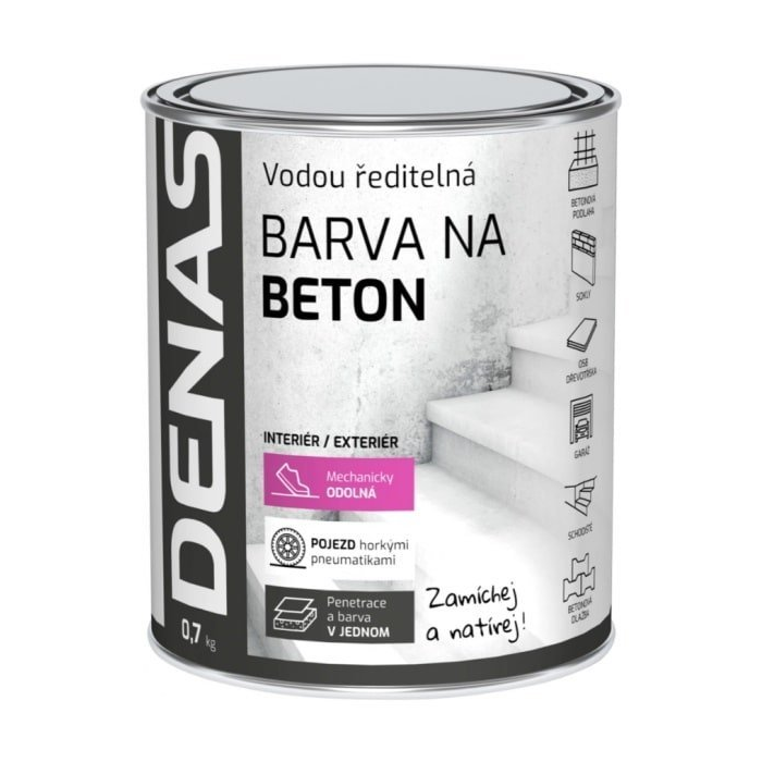 DENAS BETÓN je vodou riediteľná vrchná krycia farba na báze akrylátovej disperzie obsahujúce stálofarebné pigmenty, jemná plnivá, biocídne prostriedky, koalescenty a ďalšie prísady, upravujúce jej vlastnosti. Ako riedidlo obsahuje vodu, neobsahuje žiadne aromatické rozpúšťadlá ani lakový benzín.