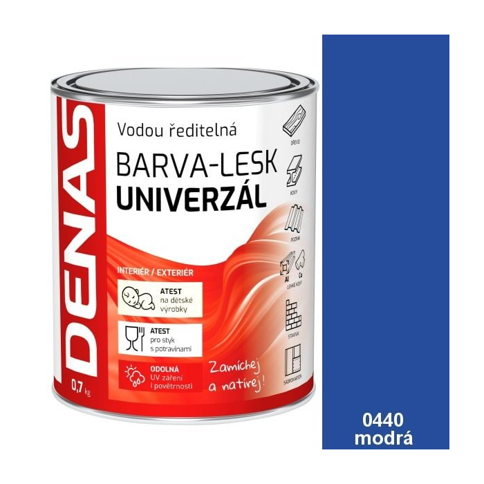 DENAS UNIVERZÁL LESK je vodou riediteľný akrylátový email určený pre vrchné nátery v interiéroch aj v exteriéroch. Farba spĺňa podmienky pre použitie na detské hračky a pre styk s potravinami. Použitie: Vrchné krycie nátery kovových, drevených a iných stavebných materiálov v exteriéroch aj interiéroch. Najčastejšie úpravy dverí, zárubní, zábradlí, okien, obkladov, záhradného nábytku, plechových striech apod. Farba je vhodná aj na renováciu starých náterov okien a dverí.