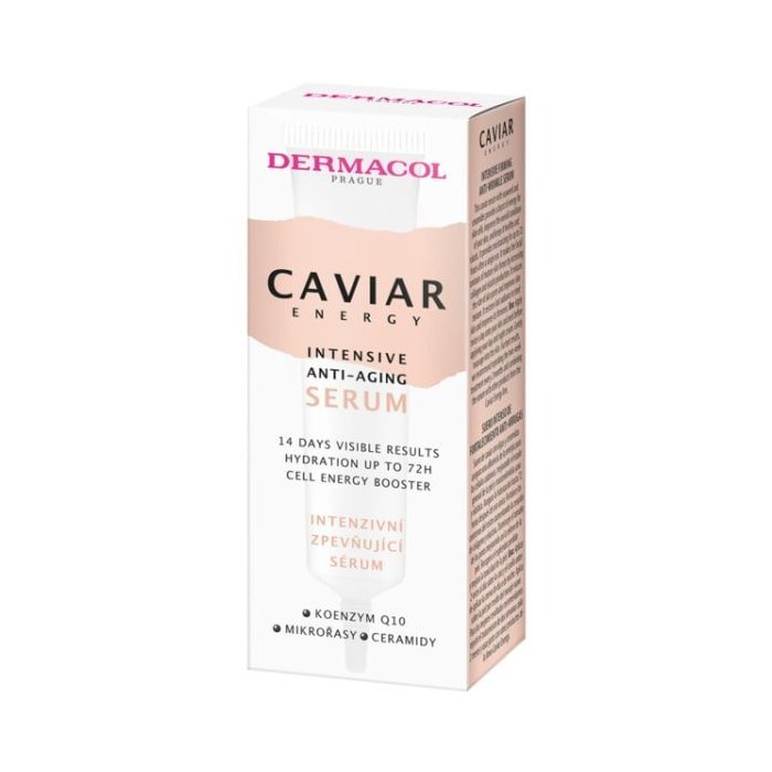 Caviar energy intenzívne spevňujúce sérum. Iba 14 dní vás delí od krajšej a mladistvejšej tváre. Spevňujúce sérum pre mladistvý vzhľad je extra jemné, ale mimoriadne účinné. Vypĺňa vrásky, hydratuje pleť a má intenzívne antioxidačné účinky. Jemná textúra intenzívneho séra je v dokonalom súlade s vašou pokožkou a po nanesení zanecháva príjemný pocit. Vďaka morským riasam, ceramidom, koenzýmu Q10, skvalénu a extraktu z ibišteka sérum obnovuje a reaktivuje bunky v pokožke a redukuje ochabnutosť a sivý tón pleti. Účinná látka z damašskej ruže pomáha spomaliť ochabovanie pleti. Po 14 dňoch bude vaša pleť viditeľne vyhladená, spevnená, farebne zjednotená a žiariaca zdravím.