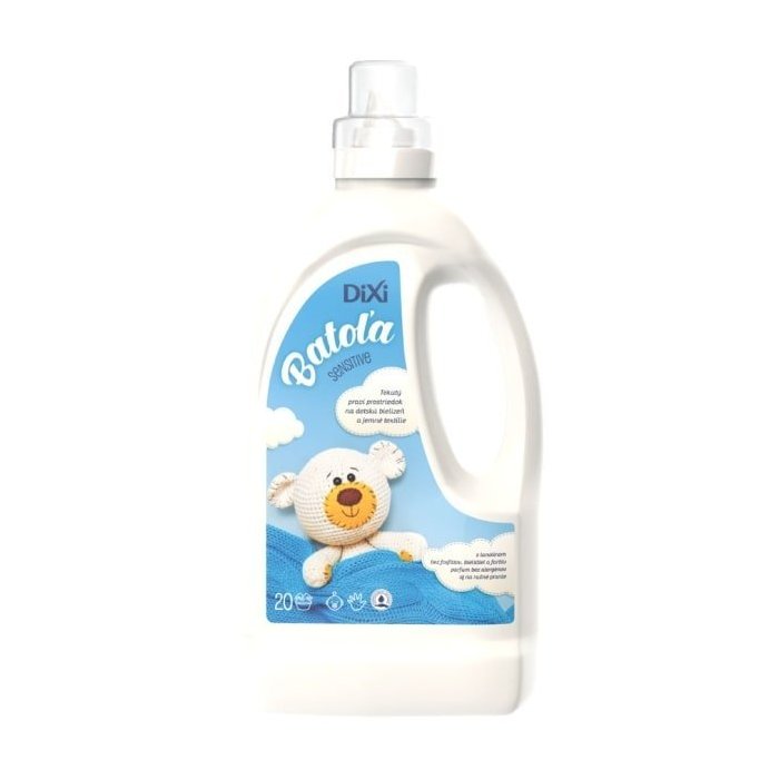 DiXi Batoľa Sensitive je tekutý prací prostriedok určený na pranie detskej bielizne a jemných textílii. Obsahuje lanolín, ktorý vlákna textílii chráni a zmäkčuje. Neobsahuje bielidla a fosfáty. Je vhodný pre všetky druhy pračiek a aj na ručné pranie. Je určený na jemné a šetrné pranie detského prádla.