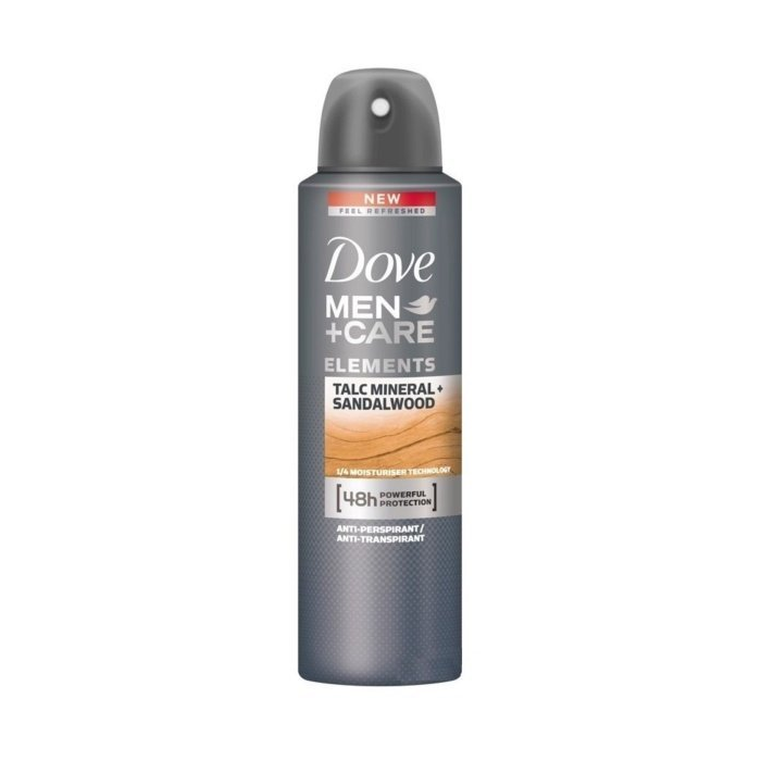 DOVE Men+Care Elements Talc Mineral+Sandalwood antiperspirant s drevitou vôňou. Aktívne chráni a osviežuje mužskú pokožku. Inšpirovaný silou prírody.