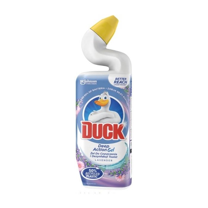 Po aplikácii tekutého čistiaceho gélu bude vaša toaleta čistá, zbavená vodného kameňa aj škvŕn. Levanduľová vôňa gélu Duck prevonia príjemne celú miestnosť.