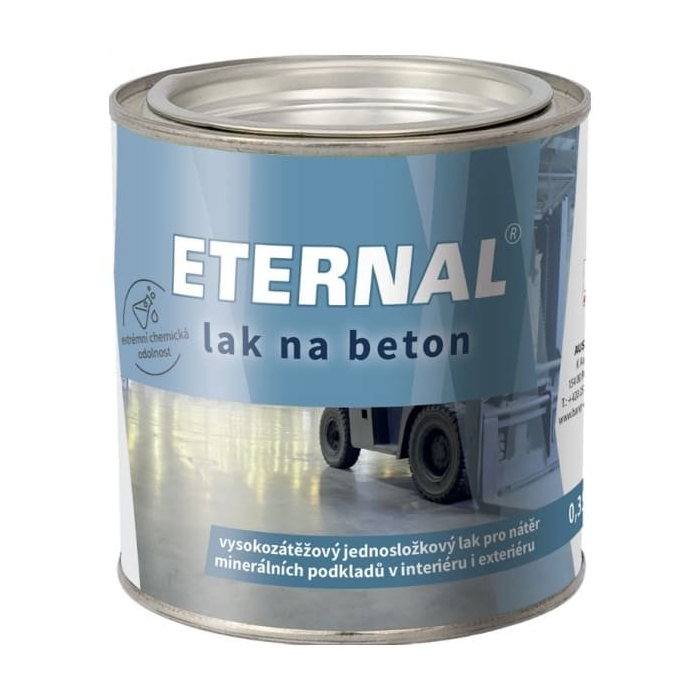 Oblasť použitia: ETERNAL lak na betón je určený na tenkovrstvým náterom minerálnych podkladov, ako sú najmä leštené aj neleštené betónové podlahy v pivniciach, garážach, dielňach, predajniach, skladoch, výstavných priestoroch, ďalej mramorové podklady, betónové a kamenné dlaždice, betónové obklady, obklady z prírodného kameňa či terasa atď. Hoci je primárne určený na minerálne podklady, je možné ho aplikovať aj na epoxidové nátery (ostatné typy náterov je nutné odstrániť).Jedná sa o jednozložkový bezrozpúšťadlový systém, ktorý je aj v kvapalnej fáze transparentný, nezapácha, ľahko sa čistí a opravuje.