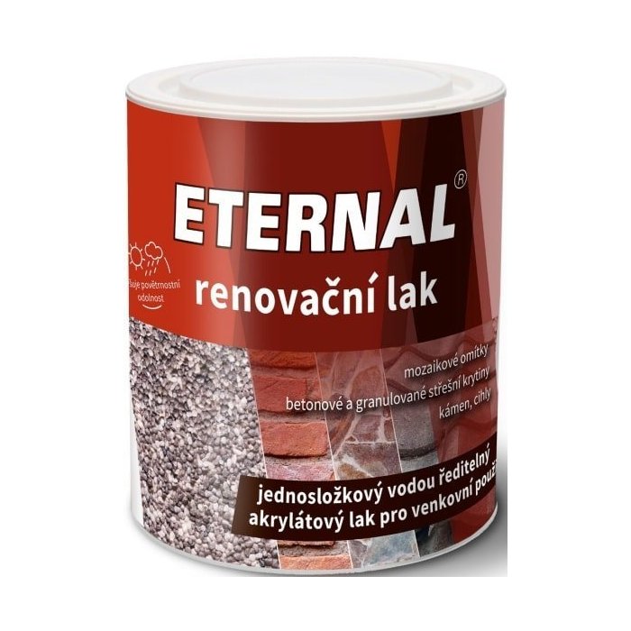 ETERNAL renovační lak je určený najmä pre obnovovacie nátery starších mozaikových omietok, betónových nepochôdznych výrobkov, betónovej strešnej krytiny, granulované strešné krytiny, nátery kameňa, tehál, vláknocementových a cementotrieskových dosiek a iných minerálnych podkladov. Môže byť tiež použitý na nátery drevených či kovových podkladov opatrených akrylátovými náterovými hmotami.