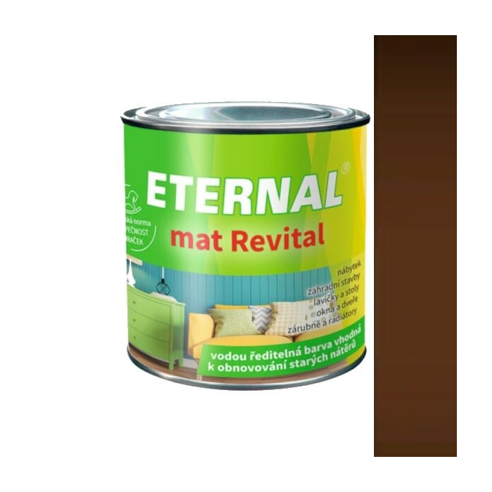 Eternal Revital Mat je vodou riediteľná farba vhodná k obnovovaniu starých náterov nábytku, okien, dverí, zárubní, radiátorov, farebných doplnkov interiérov, zahradných stavieb, lavičiek, hračiek, konštrukcií detských ihrísk. Vhodná na vnútorné aj vonkajšie použitie, k náterom dreva, kovových podkladov opatrených antikoróznym náterom, drevovláknitých a drevotrieskových dosiek, sadrokartónov, pohľadového betónu.