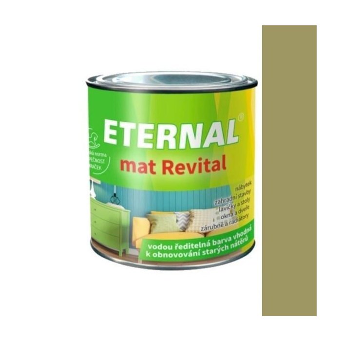 Eternal Revital Mat je vodou riediteľná farba vhodná k obnovovaniu starých náterov nábytku, okien, dverí, zárubní, radiátorov, farebných doplnkov interiérov, zahradných stavieb, lavičiek, hračiek, konštrukcií detských ihrísk. Vhodná na vnútorné aj vonkajšie použitie, k náterom dreva, kovových podkladov opatrených antikoróznym náterom, drevovláknitých a drevotrieskových dosiek, sadrokartónov, pohľadového betónu. Má veľmi dobrú priľnavosť na starých syntetických a olejových náteroch, a tým je veľmi vhodný na obnovovacie nátery.