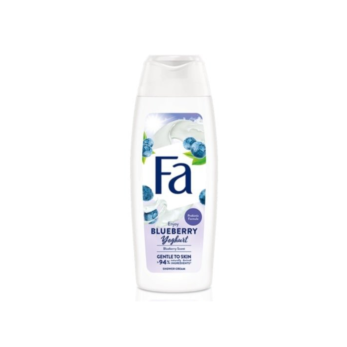 Fa Blue berry Yoghurt sprchovací krém s vôňou čučoriedok. Aplikujte pri sprchovaní na pokožku celého tela, jemne napeňte a potom opláchnite.