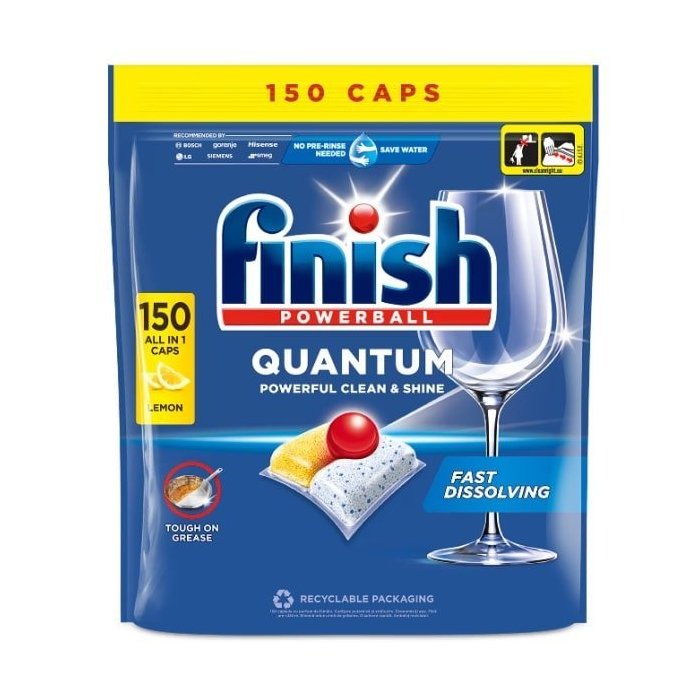 Finish Quantum All in 1 dopraje vášmu riadu žiarivý lesk a čistotu hneď na prvýkrát. Trojkomorové zloženie účinne odstráni všetky druhy nečistôt pochádzajúcich od jedla, a to aj bez predumývania.