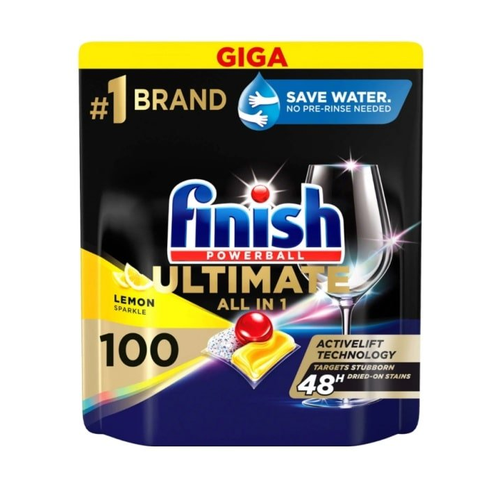 Finish Ultimate All in 1, pre pokročilú čistotu a diamantový lesk vždy a hneď po prvýkrát. Kapsula s technológiou Activelift účinne rozkladá všetky druhy zvyškov jedla, dokonca aj odolné škvrny zaschnuté 48 h, a to bez potreby predumývať. Kapsuly chránia a starajú sa o váš sklenený riad a príbory a udržujú ich lesk s každým umývaním. Náš ultimátny výkon s o 15 % nižšou hmotnosťou chemikálií v porovnaní s tabletami Finish Power All in 1.