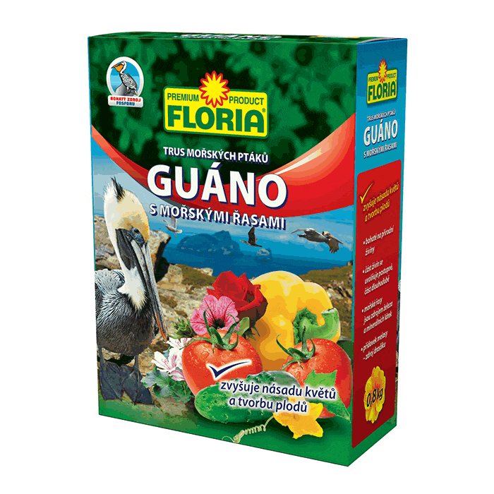 FLORIA Guáno s morskými riasami je prírodné hnojivo, ktoré dodáva rastlinám potrebné živiny a aktivuje pôdne mikroorganizmy, a to počas celého vegetačného obdobia. Používa sa na základné hnojenie pred výsadbou, prípadne na prihnojovanie rastlín v priebehu vegetácie. Je ideálny pre pestovanie ovocia, zeleniny, balkónových a okrasných rastlín, a ďalších rastlín a plodín a pôsobí 1 mesiac. Morské riasy v Guáne sú bohaté na železo a významne aktivujú rast rastlín.